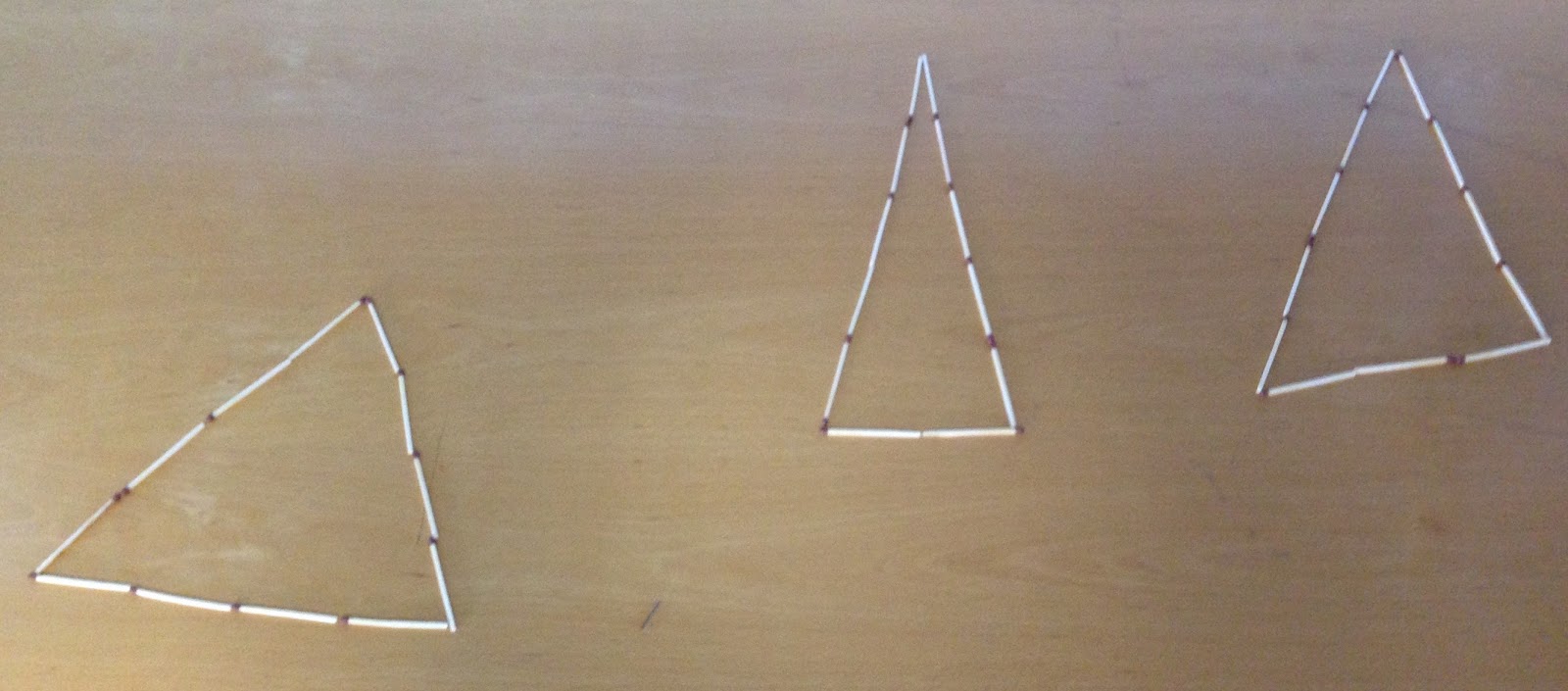 Exemple 4: si dividim els costats d'un triangle qualsevol en 2, 3 o 4 parts iguals i unim alguns dels punts obtinguts tal com es veu a la imatge, podem determinar quina fracció representen els triangles vermells respecte els triangles grans.