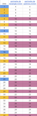 La taula anterior feta a partir de A262767 i A027709 mostra un patró molt interessant en relació al perímetre mínim quan varia el nombre de quadrets pintats (un 4 i un 6, dos 8 i dos 10, tres 12 i tres 12, ...) i malgrat que els alumnes no tinguin una fórmula explícita per repondre, és interessant pereguntar-los, per exemple, quin serà el perímetre mínim d'una figura que ocupi 70 quadrets.