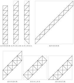 Hi veiem dos triangles (G i O, tots dos rectangles però només un d'ells isòsceles), 9 quadrilàters (un quadrat A, un altre rectangle N, un rombe C, un estel F, altres dos paral·lelograms D i H i un trapezi isòsceles E), 8 pentàgons (dos d'ells simètrics: Z i K) i 5 hexàgons (dos d'ells simètrics: B i S).